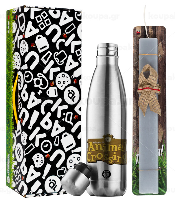 Animal Crossing, Easter Set, metallic stainless thermos flask (500ml) & scented flat Easter candle (30cm) (GRAY)