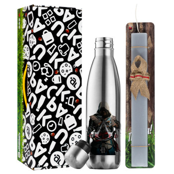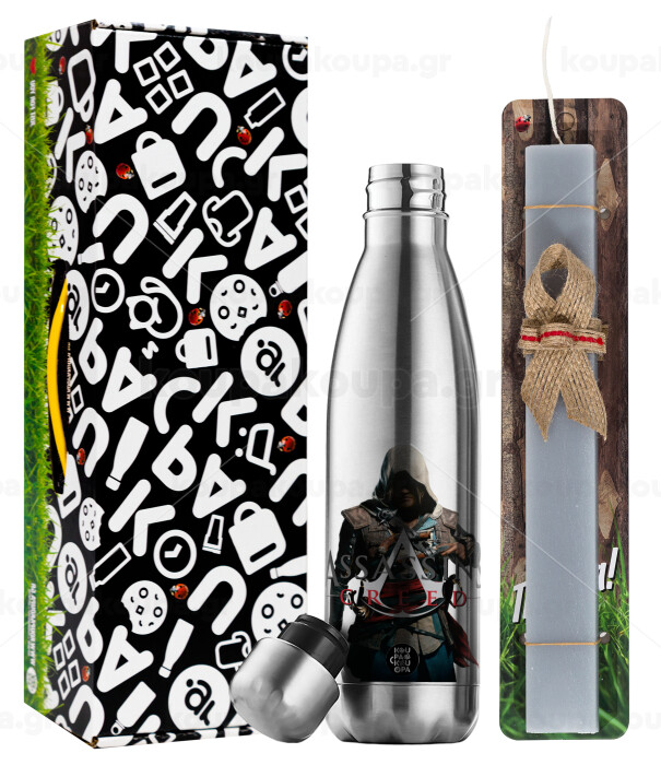 Assassin's Creed, Easter Set, metallic stainless thermos flask (500ml) & scented flat Easter candle (30cm) (GRAY)