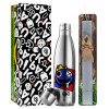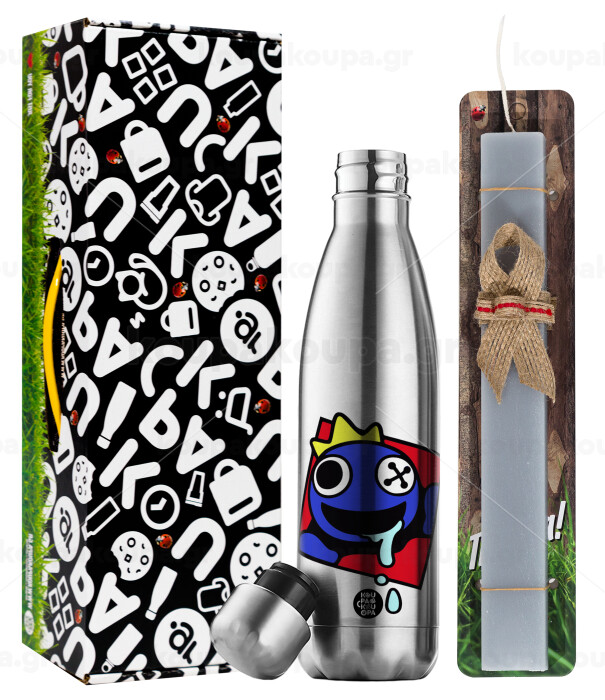 Blue, Rainbow friends, Easter Set, metallic stainless thermos flask (500ml) & scented flat Easter candle (30cm) (GRAY)