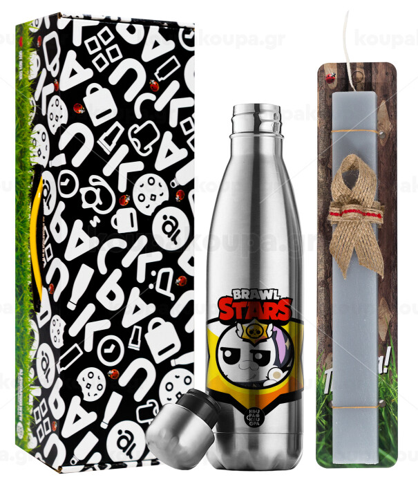 Brawl Stars Kit, Easter Set, metallic stainless thermos flask (500ml) & scented flat Easter candle (30cm) (GRAY)