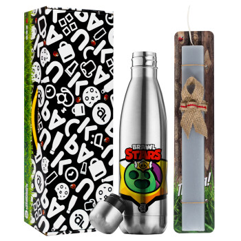 Brawl Stars Spike, Easter Set, metallic stainless thermos flask (500ml) & scented flat Easter candle (30cm) (GRAY)