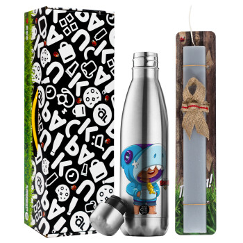 Brawl Stars Leon Shark, Easter Set, metallic stainless thermos flask (500ml) & scented flat Easter candle (30cm) (GRAY)