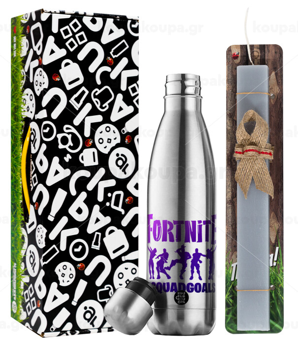 Fortnite #squadgoals, Easter Set, metallic stainless thermos flask (500ml) & scented flat Easter candle (30cm) (GRAY)