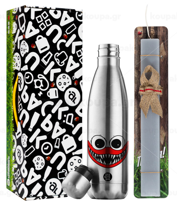 Huggy wuggy, Easter Set, metallic stainless thermos flask (500ml) & scented flat Easter candle (30cm) (GRAY)