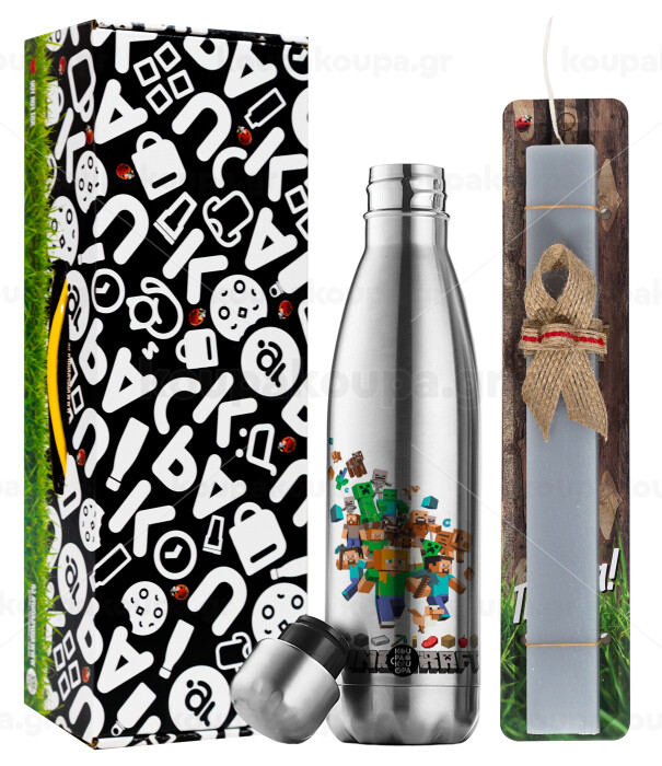 Minecraft adventure, Easter Set, metallic stainless thermos flask (500ml) & scented flat Easter candle (30cm) (GRAY)