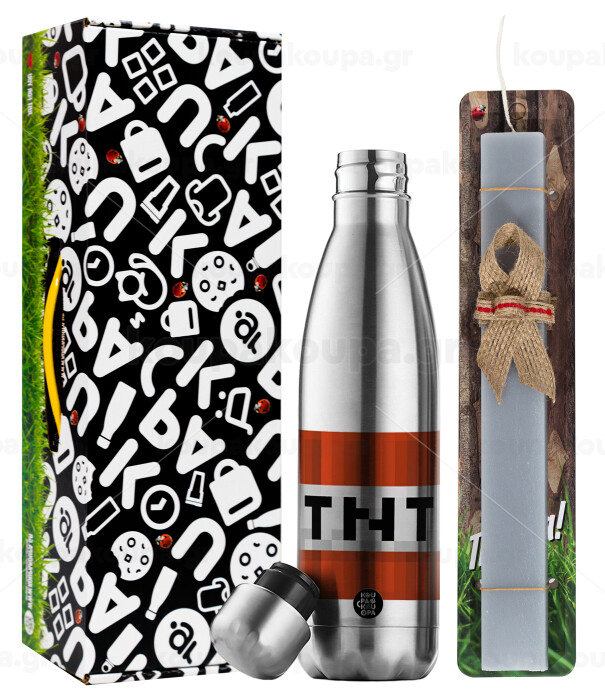 Minecraft TNT, Easter Set, metallic stainless thermos flask (500ml) & scented flat Easter candle (30cm) (GRAY)