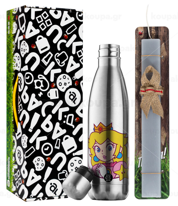 Princess Peach, Easter Set, metallic stainless thermos flask (500ml) & scented flat Easter candle (30cm) (GRAY)