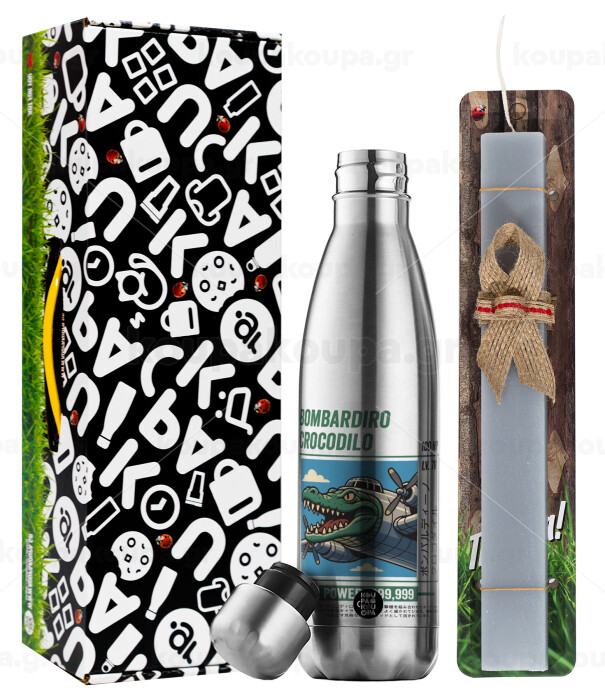 Bombardiro Crocodilo, Easter Set, metallic stainless thermos flask (500ml) & scented flat Easter candle (30cm) (GRAY)