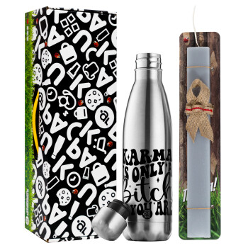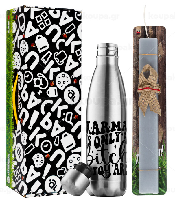 Karma is Only A Bitch if You Are, Easter Set, metallic stainless thermos flask (500ml) & scented flat Easter candle (30cm) (GRAY)