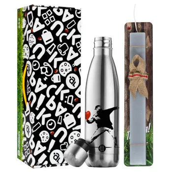 Banksy (The heart thrower), Easter Set, metallic stainless thermos flask (500ml) & scented flat Easter candle (30cm) (GRAY)