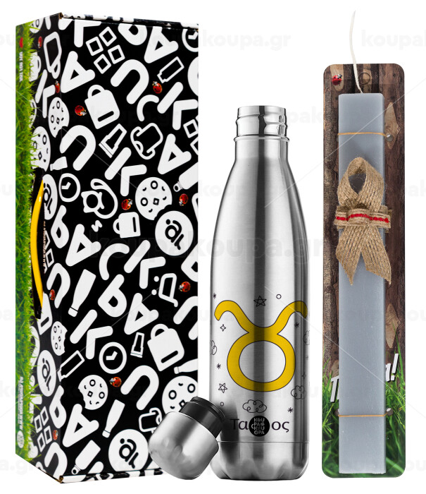 Ζώδια Ταύρος, Easter Set, metallic stainless thermos flask (500ml) & scented flat Easter candle (30cm) (GRAY)
