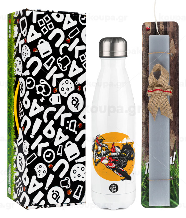 Motocross, Easter candle, metallic white thermos bottle (500ml) & aromatic flat candle (30cm) (GRAY)