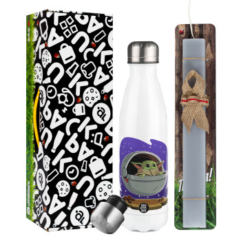 Baby Yoda mandalorian, Easter candle, metallic white thermos bottle (500ml) & aromatic flat candle (30cm) (GRAY)