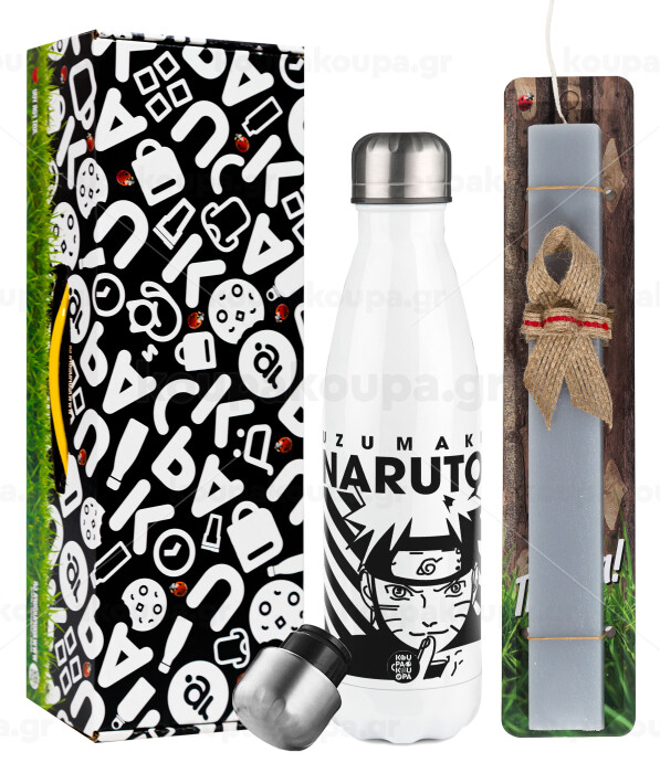 Naruto uzumaki, Easter candle, metallic white thermos bottle (500ml) & aromatic flat candle (30cm) (GRAY)