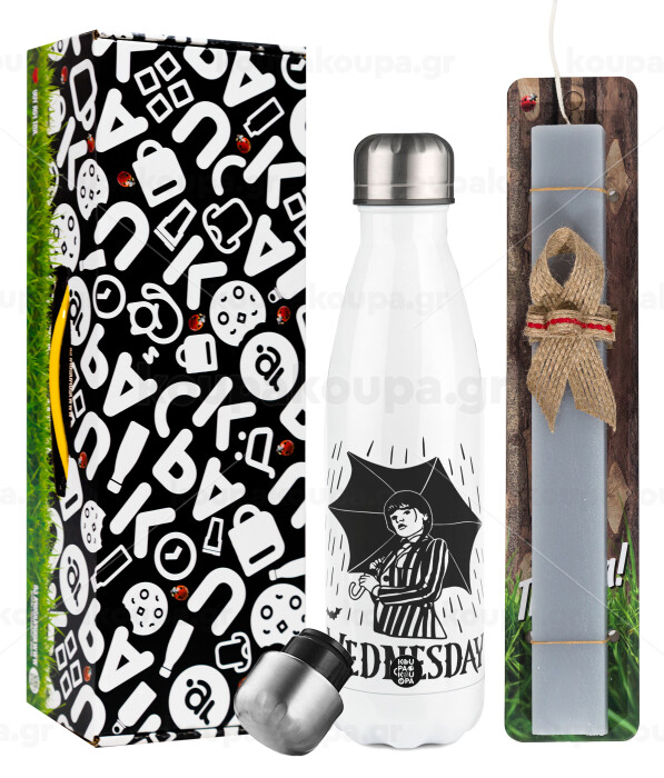 Wednesday Addams, Easter candle, metallic white thermos bottle (500ml) & aromatic flat candle (30cm) (GRAY)