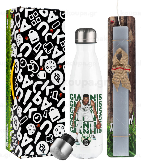 Giannis Antetokounmpo, Easter candle, metallic white thermos bottle (500ml) & aromatic flat candle (30cm) (GRAY)