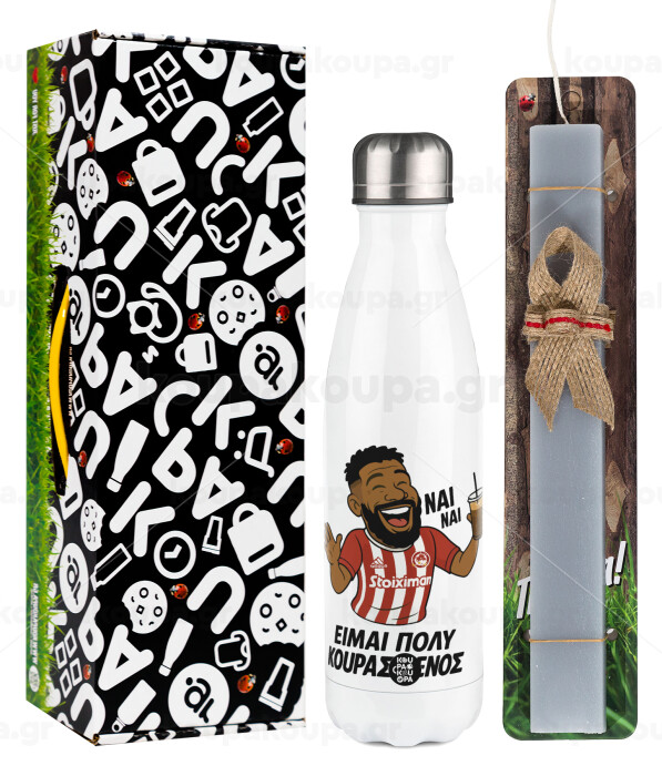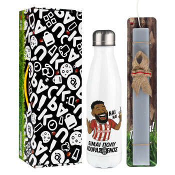 Ροντινέι, "ΠΟΛΥ ΚΟΥΡΑΣΜΕΝΟΣ", Easter candle, metallic white thermos bottle (500ml) & aromatic flat candle (30cm) (GRAY)