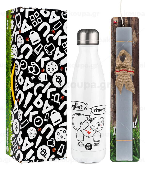 Τι έχεις? Τίποτα!, Easter candle, metallic white thermos bottle (500ml) & aromatic flat candle (30cm) (GRAY)