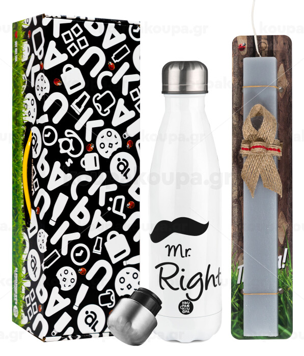 Mr right Mustache, Easter candle, metallic white thermos bottle (500ml) & aromatic flat candle (30cm) (GRAY)