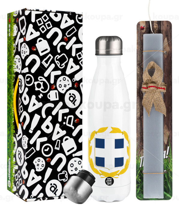 Hellas Εθνόσημο, Easter candle, metallic white thermos bottle (500ml) & aromatic flat candle (30cm) (GRAY)