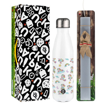Unicorn pattern, Easter candle, metallic white thermos bottle (500ml) & aromatic flat candle (30cm) (GRAY)