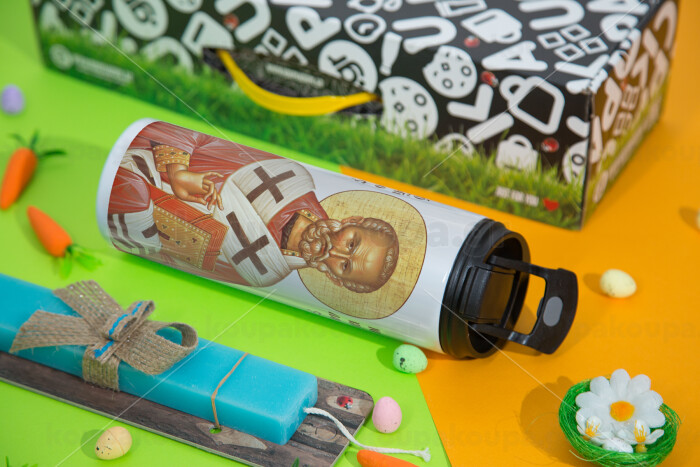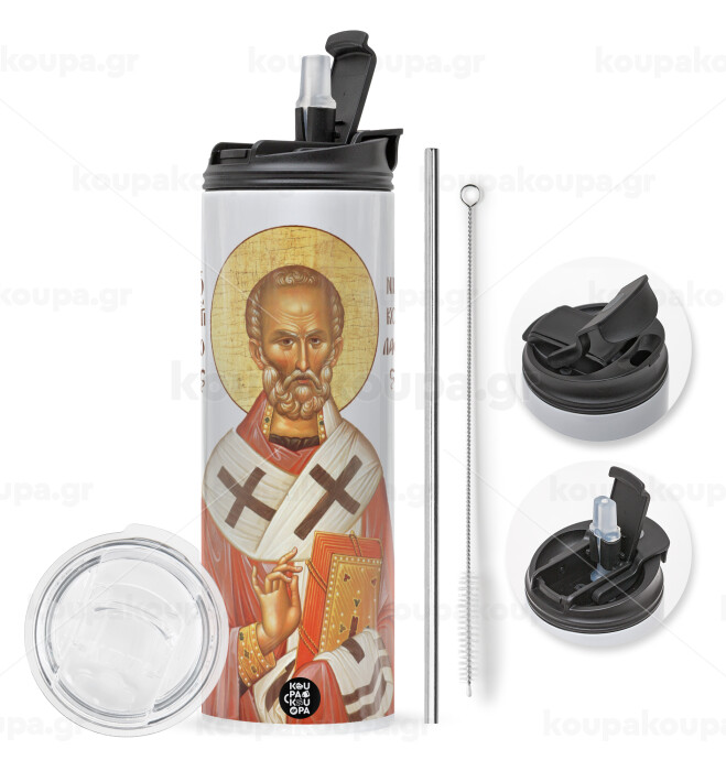 Saint Nicholas orthodox , Easter candle,Travel Tumbler 2 Lids, with metal straw & cleaning brush & aromatic flat candle (30cm) (BLUE)