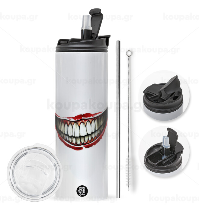 Joker smile, Easter candle,Travel Tumbler 2 Lids, with metal straw & cleaning brush & aromatic flat candle (30cm) (BLUE)