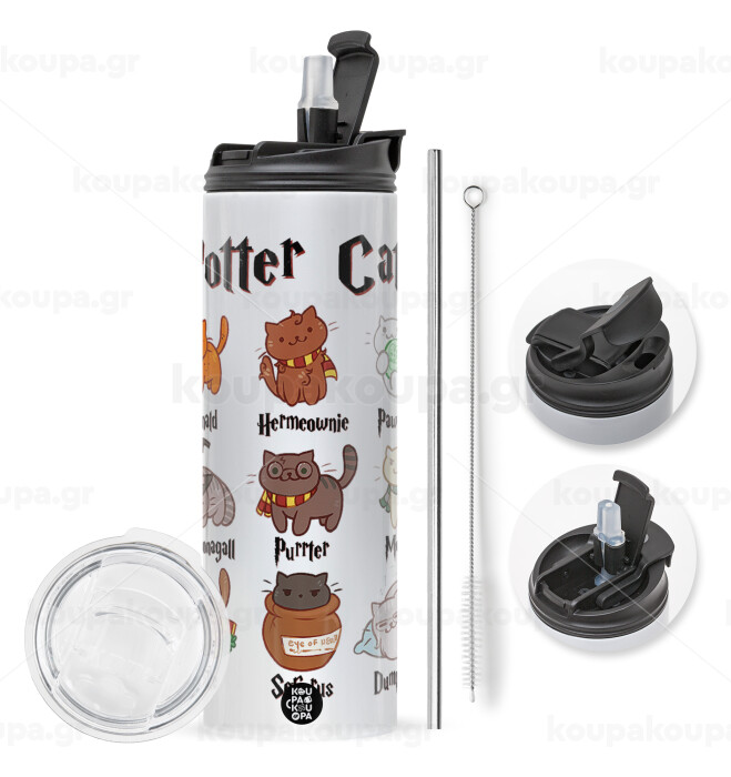Potter Cats, Easter candle,Travel Tumbler 2 Lids, with metal straw & cleaning brush & aromatic flat candle (30cm) (BLUE)