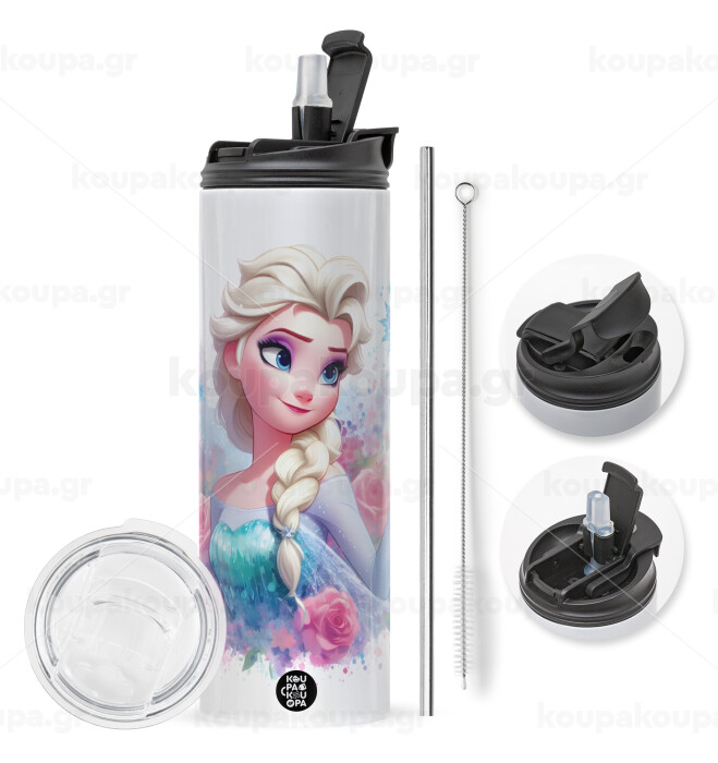 Elsa Princess, Easter candle,Travel Tumbler 2 Lids, with metal straw & cleaning brush & aromatic flat candle (30cm) (BLUE)