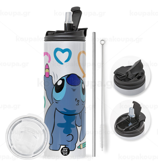 Lilo & Stitch painting, Easter candle,Travel Tumbler 2 Lids, with metal straw & cleaning brush & aromatic flat candle (30cm) (BLUE)
