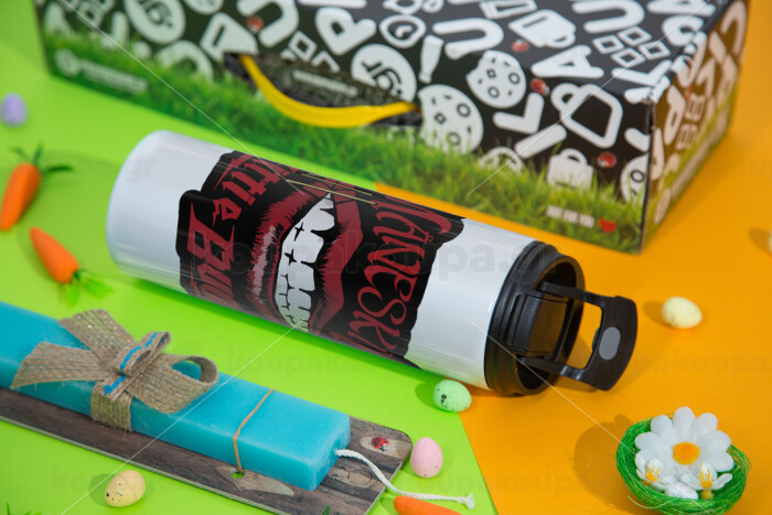 Maneskin lips, Easter candle,Travel Tumbler 2 Lids, with metal straw & cleaning brush & aromatic flat candle (30cm) (BLUE)