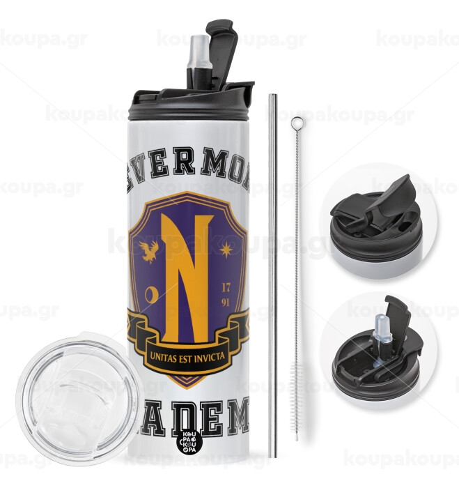 Wednesday Nevermore Academy University, Easter candle,Travel Tumbler 2 Lids, with metal straw & cleaning brush & aromatic flat candle (30cm) (BLUE)