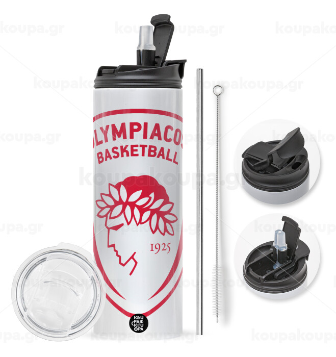 Olympiacos B.C., Easter candle,Travel Tumbler 2 Lids, with metal straw & cleaning brush & aromatic flat candle (30cm) (BLUE)