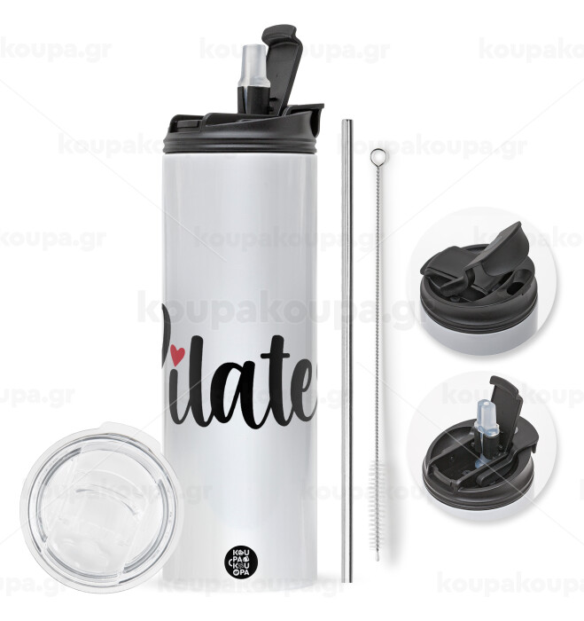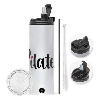 Pilates love, Easter candle,Travel Tumbler 2 Lids, with metal straw & cleaning brush & aromatic flat candle (30cm) (BLUE)