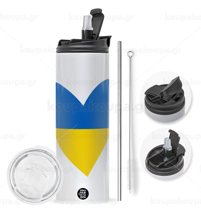 UKRAINE heart, Easter candle,Travel Tumbler 2 Lids, with metal straw & cleaning brush & aromatic flat candle (30cm) (BLUE)