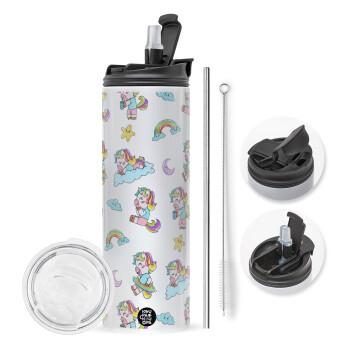 Unicorn pattern, Easter candle,Travel Tumbler 2 Lids, with metal straw & cleaning brush & aromatic flat candle (30cm) (BLUE)
