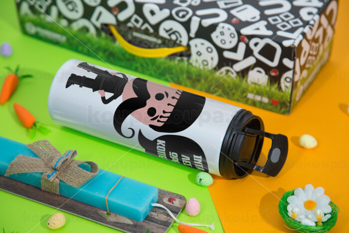 Κρητικός "Ίντα λες ωρέ κοπέλι", Easter candle,Travel Tumbler 2 Lids, with metal straw & cleaning brush & aromatic flat candle (30cm) (BLUE)