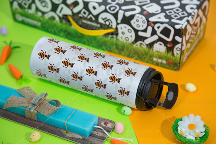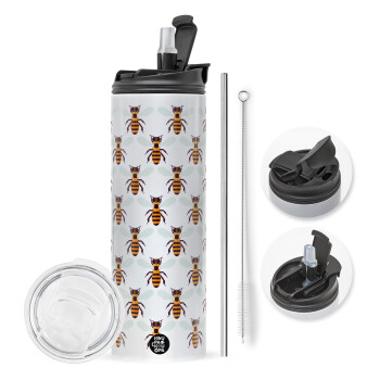 Bee, Easter candle,Travel Tumbler 2 Lids, with metal straw & cleaning brush & aromatic flat candle (30cm) (BLUE)