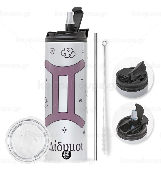 Ζώδια Δίδυμοι, Easter candle,Travel Tumbler 2 Lids, with metal straw & cleaning brush & aromatic flat candle (30cm) (BLUE)