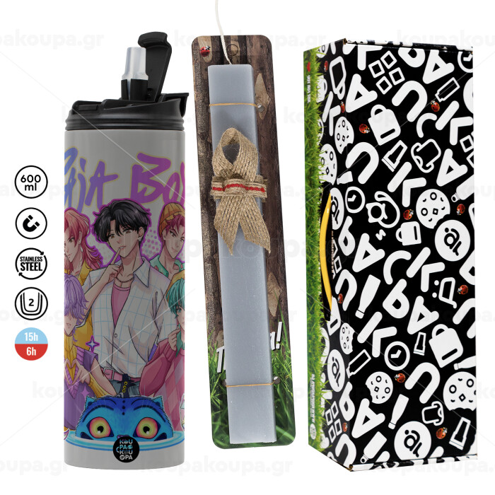 Huntrix Saja Boys, Easter candle with Grey Tumbler Thermo 600ml & aromatic flat candle (30cm) (GREY)