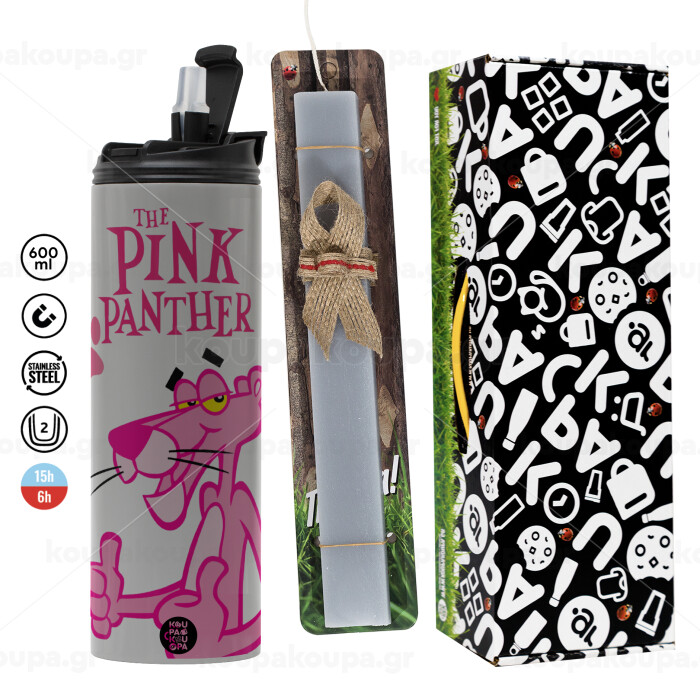 The pink panther, Easter candle with Grey Tumbler Thermo 600ml & aromatic flat candle (30cm) (GREY)