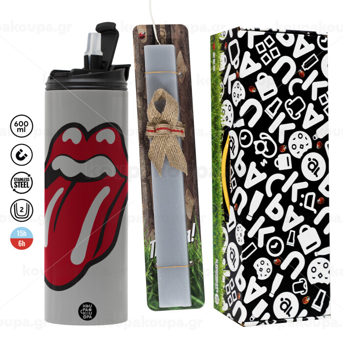 Rolling Stones Kiss, Easter candle with Grey Tumbler Thermo 600ml & aromatic flat candle (30cm) (GREY)