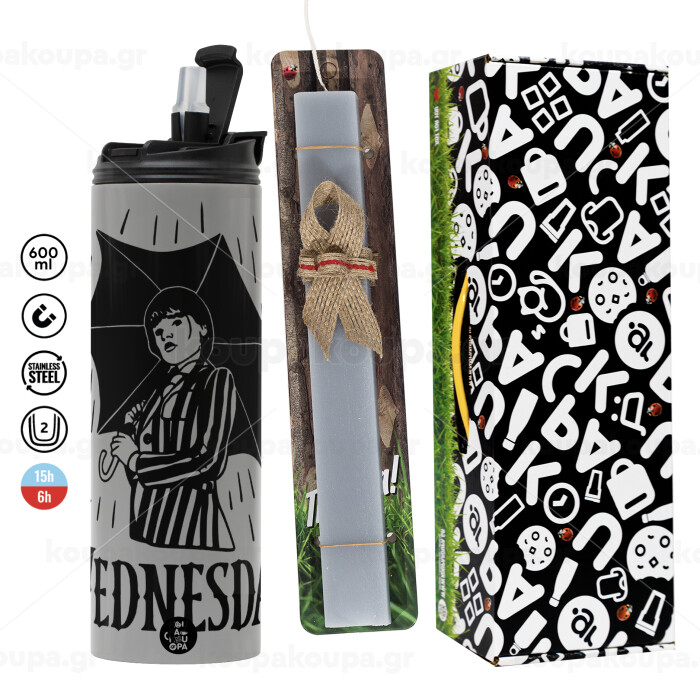 Wednesday Addams, Easter candle with Grey Tumbler Thermo 600ml & aromatic flat candle (30cm) (GREY)