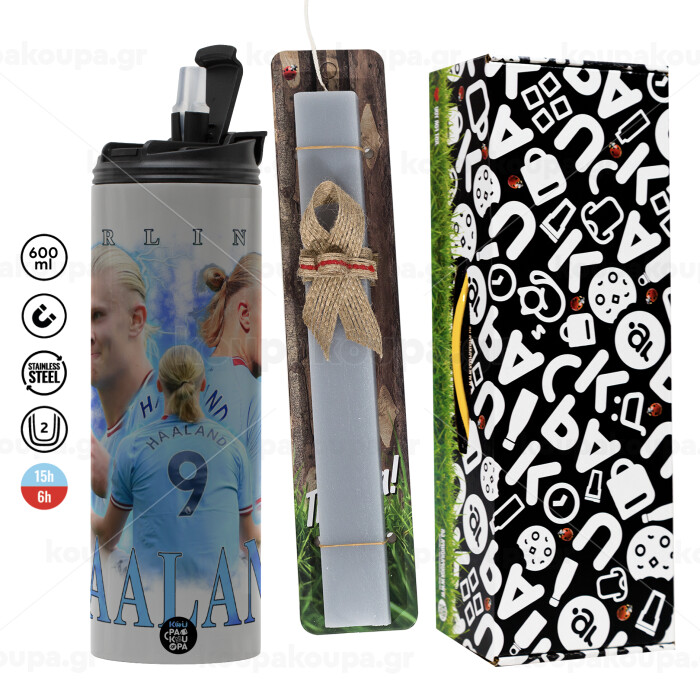 Erling Haaland, Easter candle with Grey Tumbler Thermo 600ml & aromatic flat candle (30cm) (GREY)