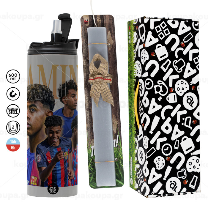 lamine yamal FCB, Easter candle with Grey Tumbler Thermo 600ml & aromatic flat candle (30cm) (GREY)