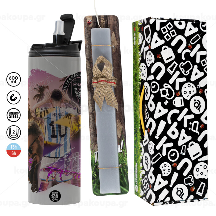 Lionel Messi Miami, Easter candle with Grey Tumbler Thermo 600ml & aromatic flat candle (30cm) (GREY)