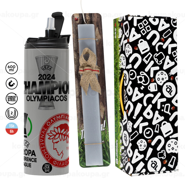 Olympiacos UEFA Europa Conference League Champion 2024, Easter candle with Grey Tumbler Thermo 600ml & aromatic flat candle (30cm) (GREY)