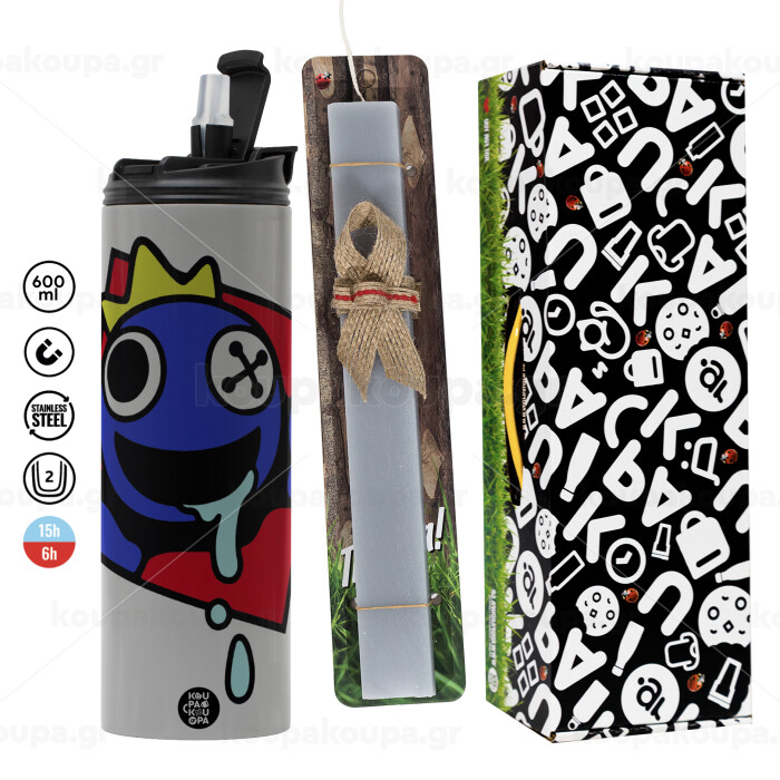 Blue, Rainbow friends, Easter candle with Grey Tumbler Thermo 600ml & aromatic flat candle (30cm) (GREY)