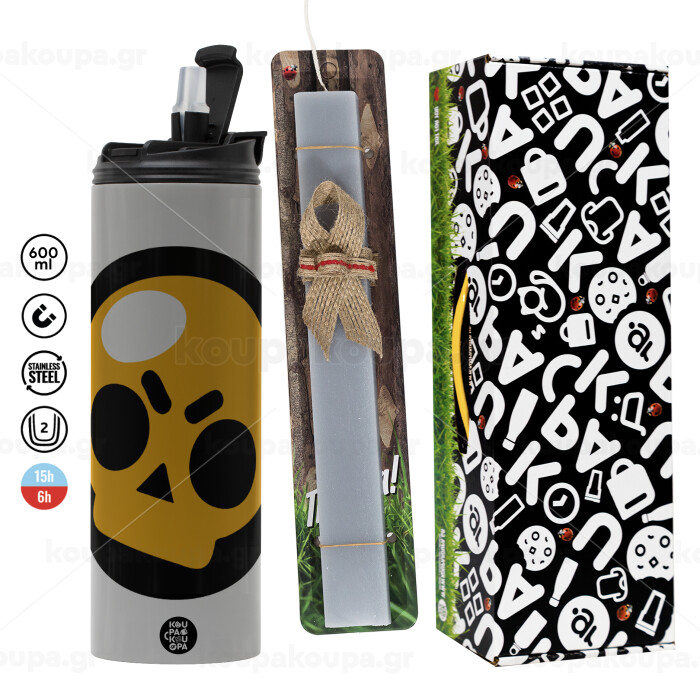 Brawl Stars Skull, Easter candle with Grey Tumbler Thermo 600ml & aromatic flat candle (30cm) (GREY)