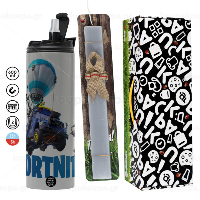 Fortnite Bus, Easter candle with Grey Tumbler Thermo 600ml & aromatic flat candle (30cm) (GREY)